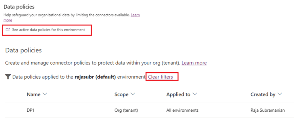 - ”Clear Filter” can be removed to see the Data Policies which are applied to all the environments