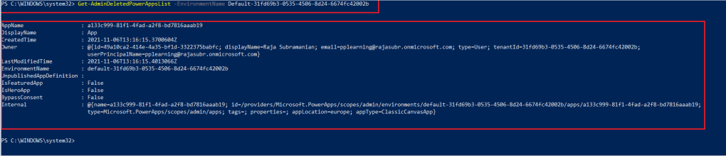 - Run the code to list out all the deleted Power apps