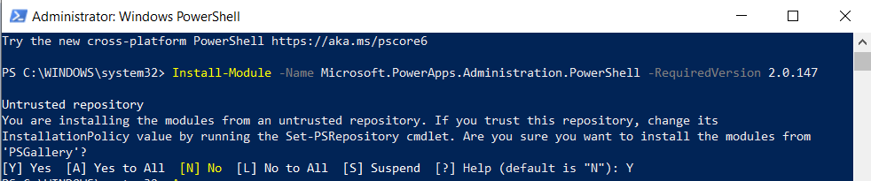 Install-Module -Name Microsoft.PowerApps.Administration.PowerShell -RequiredVersion 2.0.147